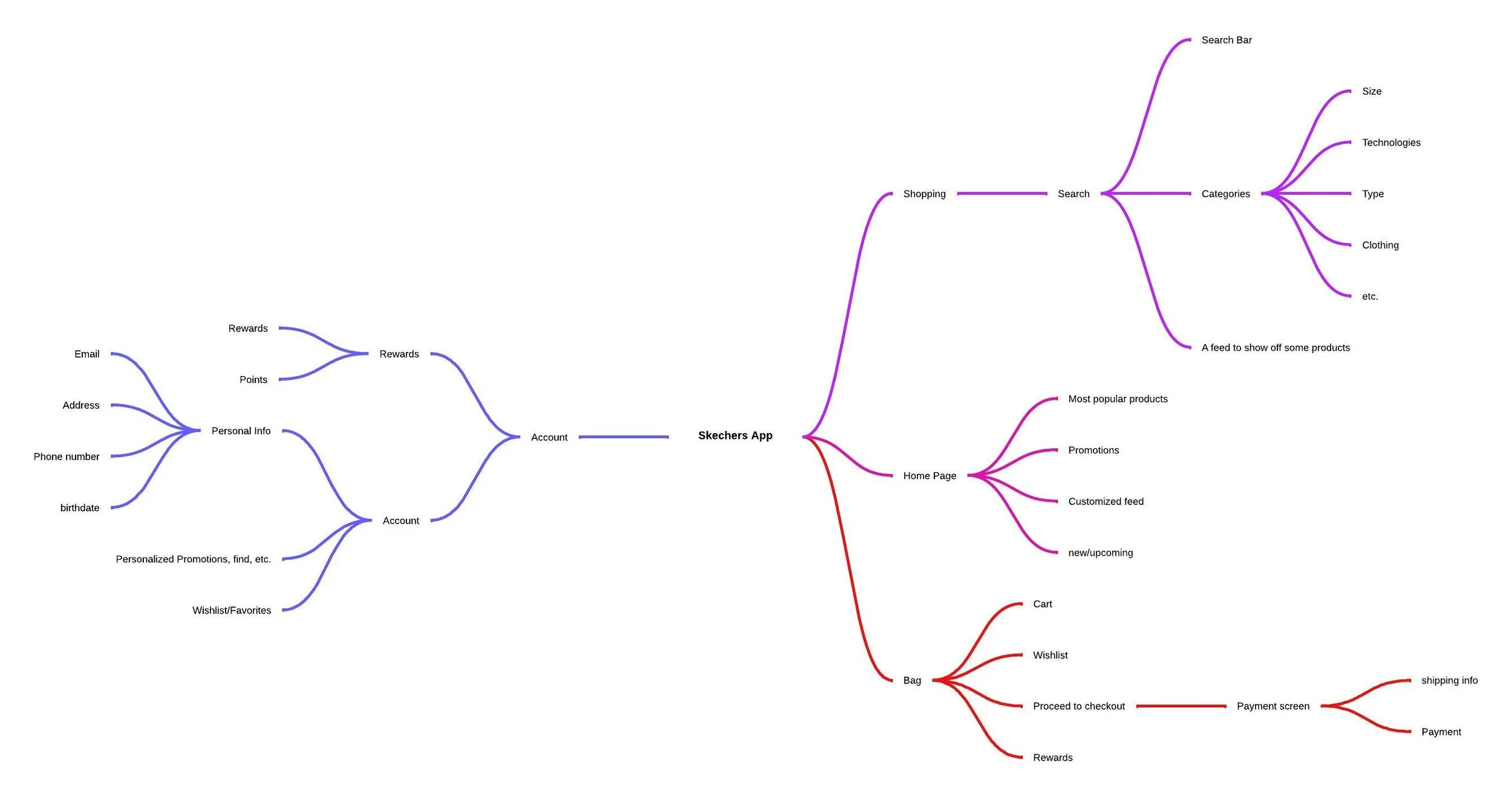 The team created a mind map for the redesign of the Skechers app to visually organize and explore key ideas. This approach helped us break down the app's features, user needs, and potential improvements. By mapping out the relationships between different elements, we were able to identify priorities, streamline the user experience, and brainstorm new features like AR try-ons. The mind map guided our design process and ensured a more cohesive and app experience.
